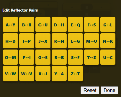 Na ovom dijelu stroja možeš vidjeti parove slova na primjer A↔Y, B↔R, ovo znači da su ta slova međusobno povezana. Kada stroj naiđe na slovo A, on će ga zamijeniti slovom Y, i obrnuto. Takve zamjene dodatno skrivaju poruku i čine šifru težom za otkrivanje. Reflektor ima unaprijed uređene parove slova koji su stalni.