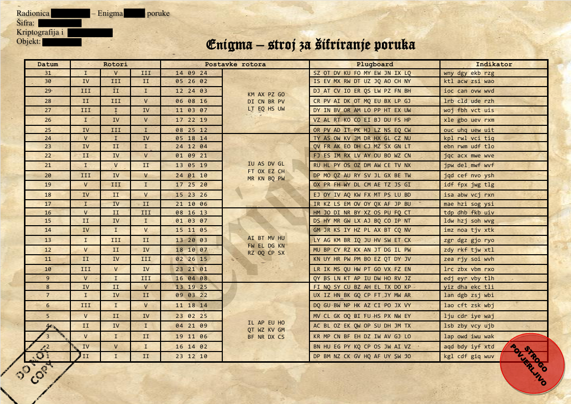 5. Prijatelj namjesti svoj Enigma stroj na iste postavke, utipka šifriranu poruku i voilà, pojavi se tvoja poruka.
